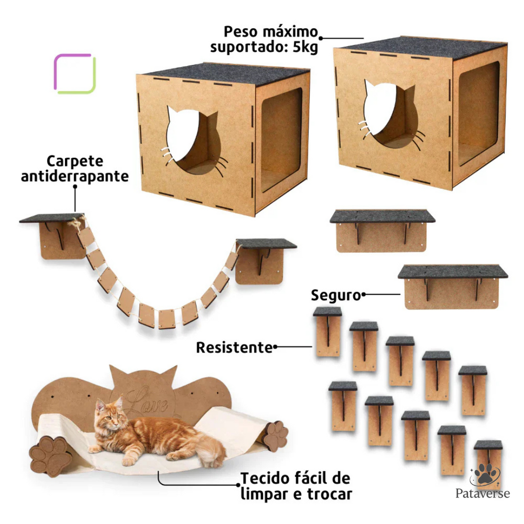 Diversão Sem Limites: Com nichos espaçosos, rede de descanso confortável, ponte desafiadora, degraus ágeis e prateleiras versáteis, seu gato vai pular, escalar e relaxar como nunca. São 16 peças customizáveis – monte do jeito que quiser e crie o playground perfeito para o temperamento do seu pet! 🎉